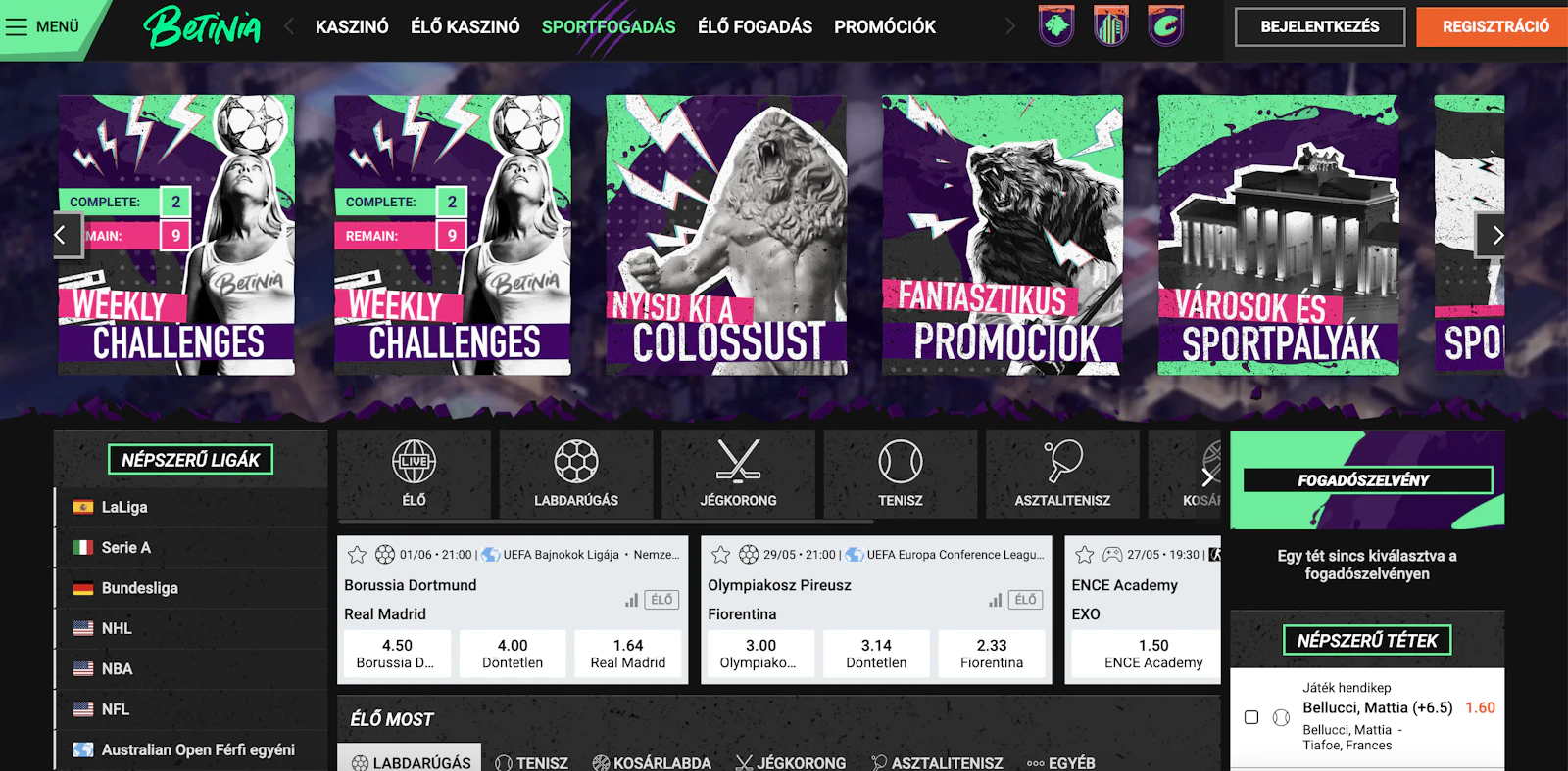 És ami a legjobb: nem csak a focira érdemes figyelni. A Betinia a kosárlabda, a jégkorong és a tenisz területén is nagyon erős. Itt is folyamatosan frissül a kínálat, és a legfontosabb meccsek mindig ott vannak a listán.