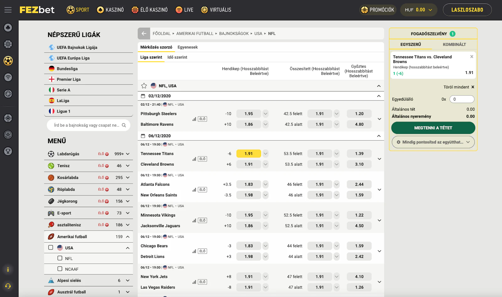 A fogadási piacok listába rendezve elérhetőek a FEZbet hivatalos oldalán is.